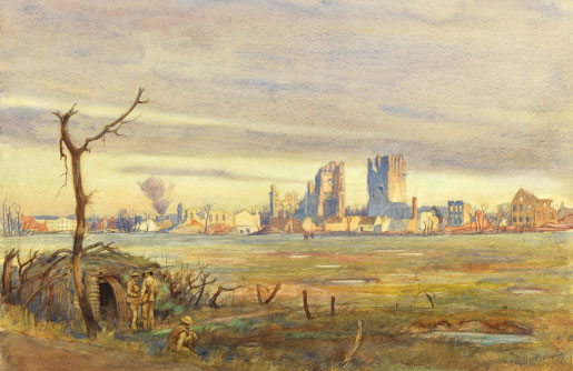 - Banner photo: the watercolour “First Glimpse at Ypres” depicts the ruins of the Cloth Hall in Ypres, Belgium, which Canadian troops defended in April 1915. The crude shelter in the foreground provided respite for soldiers. Credit: Lieutenant Cyril Henry Barraud, Canadian War Museum.